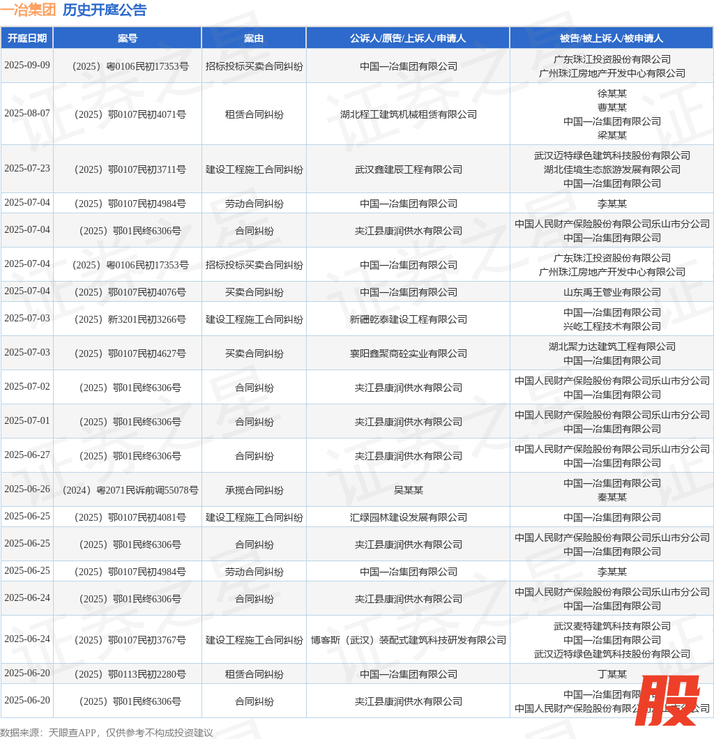 本站消息淘股神,根据天眼查APP显示,近日公布了一则中国一冶集团有限公司作为被告/被上诉人的开庭公告,详细内容如下: